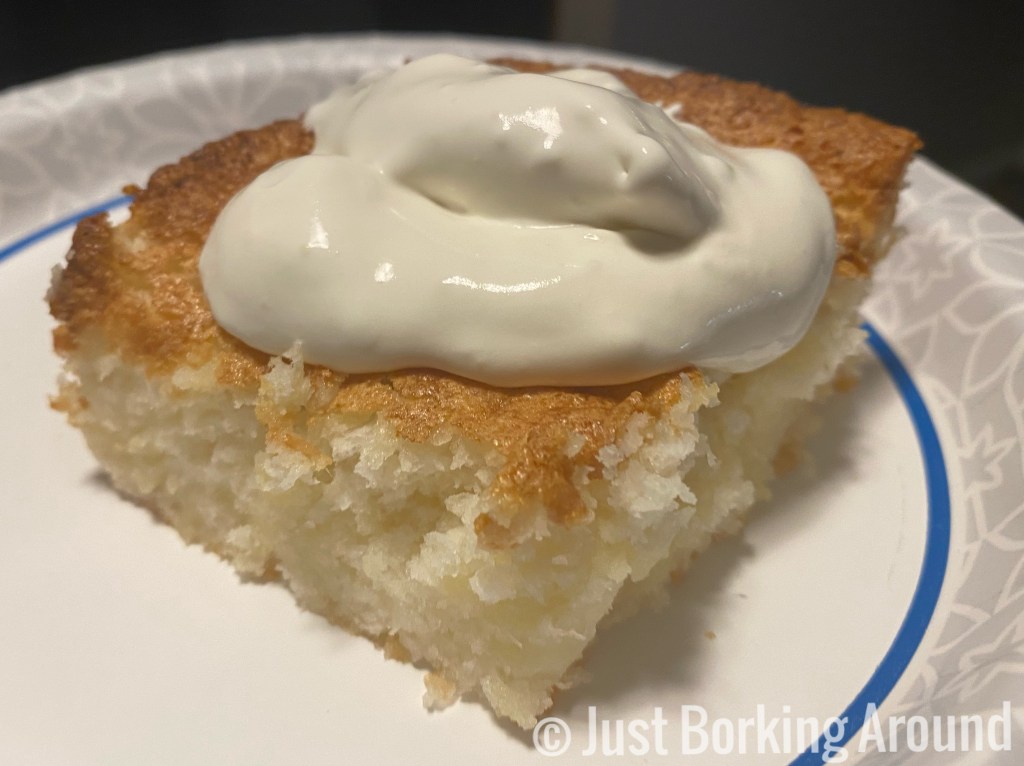 - Combine cool whip and rum extract. Spread over cooled cake evenly. Cut and serve.