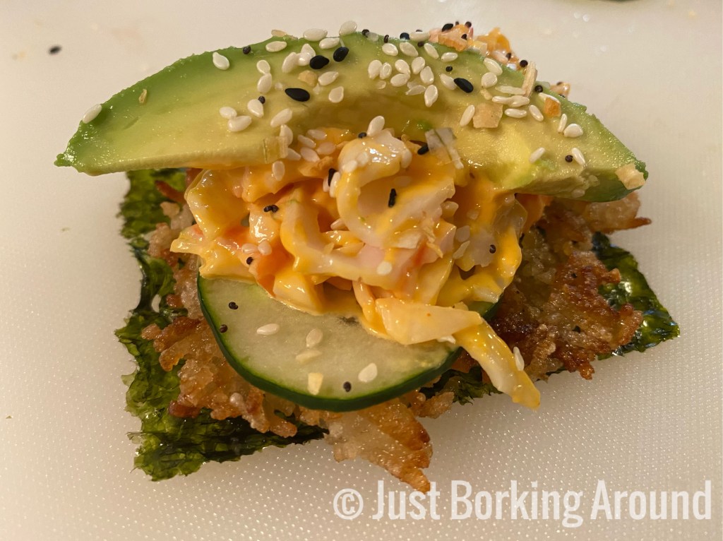 - To assemble place in this order: Sliced cucumber, seaweed snack, rice patty, crab mixture, avocado, & then top with Everything But the Bagel seasoning. Drizzle on soy sauce to your liking.