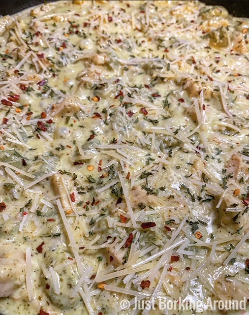 - Remove from the heat and top w/ remaining parmesan cheese and garnish with parsley and pepper flakes.