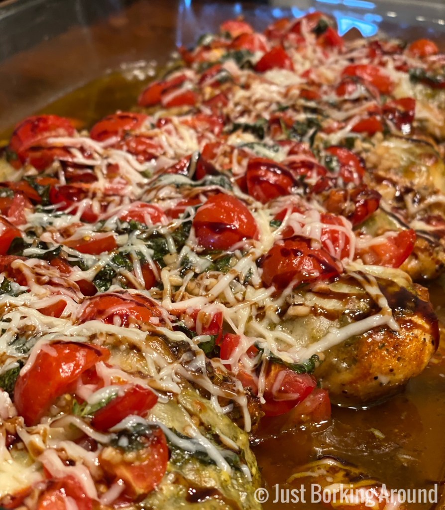 - Combine all the seasonings in the second set group of ingredients and stir until combined. Sprinkle chicken breasts on both sides with seasoning mixture. Place filets into prepared baking dish. Spoon pesto onto top of each breast and finish off w/ a slice of cheese. Bake for about 20 minutes or until chicken is cooked through.